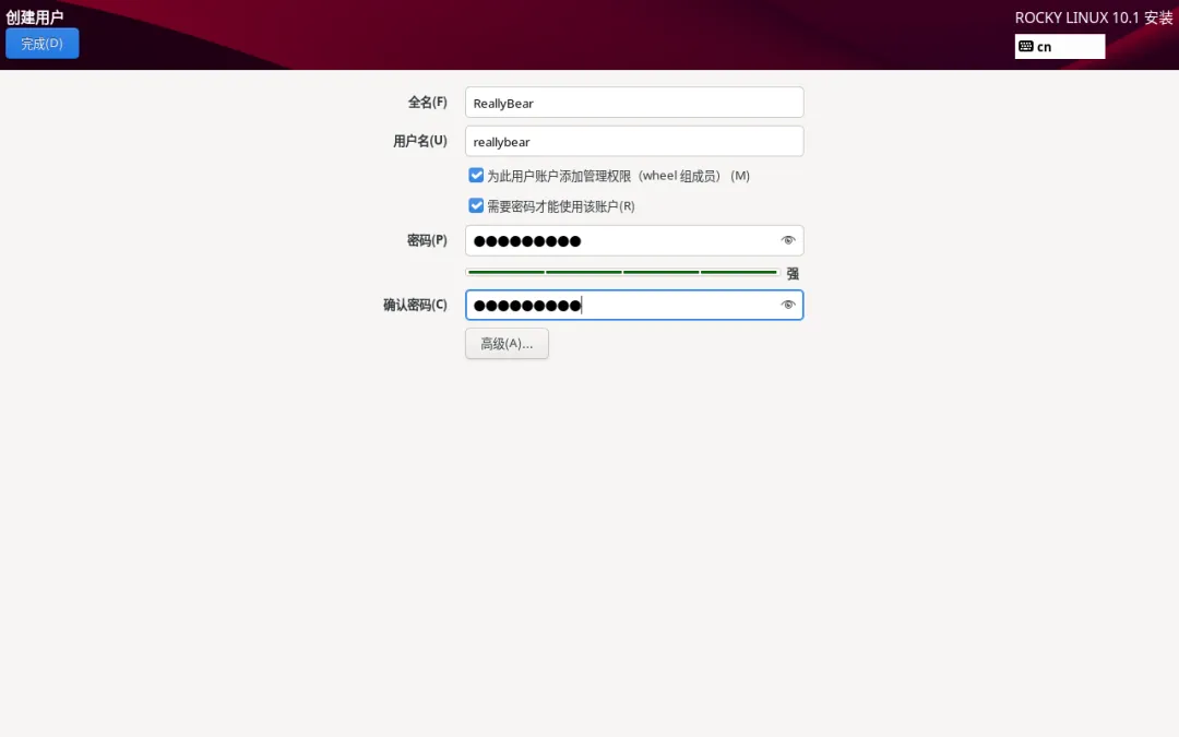 (2)创建用户:还可以为系统添加额外的普通用户,进入“创建用户”界面,输入用户名和密码,如果使用的是弱密码,则需要单击两次“完成”按钮,如图所示。