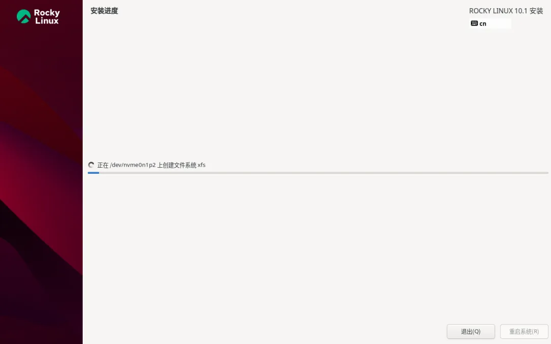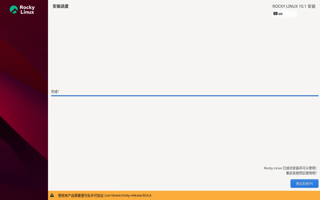 第6步,等待所有软件包安装完成后,提示重启系统,如图所示。点击“重启系统”,Rockey Linux操作系统就安装完成了。