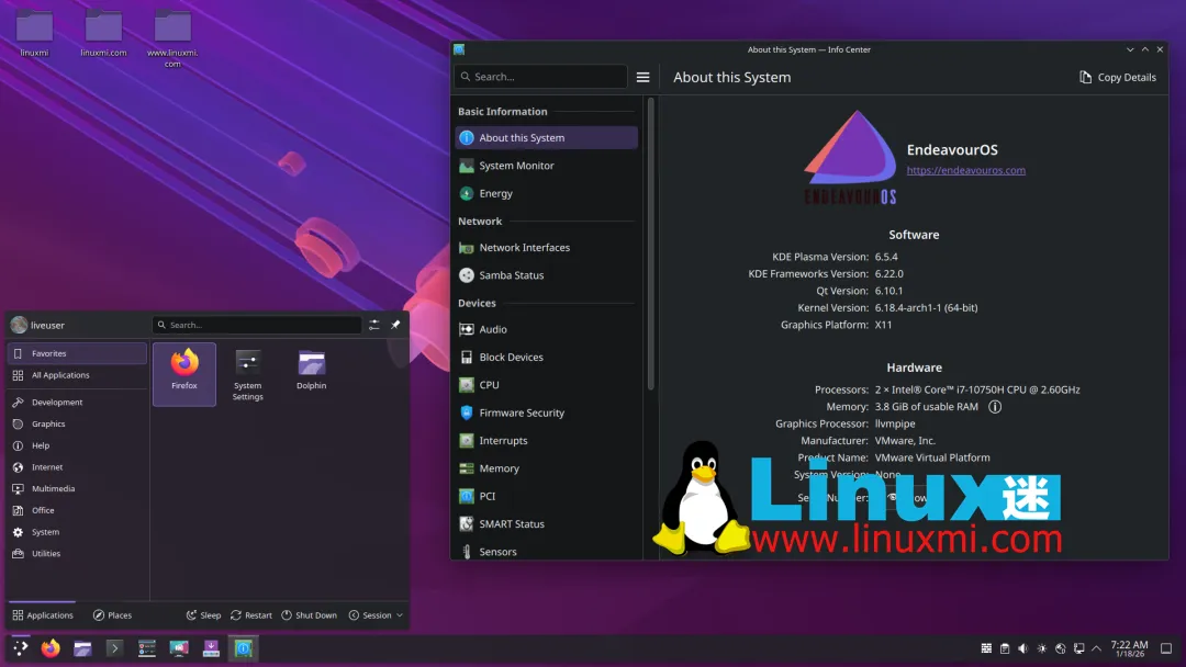 在系统基础上,Ganymede Neo 默认采用 Linux 6.18 LTS 内核,在稳定性和长期支持方面更有保障。桌面环境继续使用成熟的 KDE Plasma 方案,组合为 KDE Plasma 6.5.4 + KDE Frameworks 6.22 + KDE Gear 25.12.1。这种配置让用户无需经历手动安装 Arch Linux 的复杂流程,也能直接获得接近原生 Arch 的现代 KDE 桌面体验。