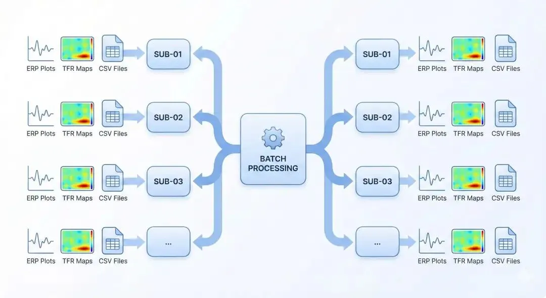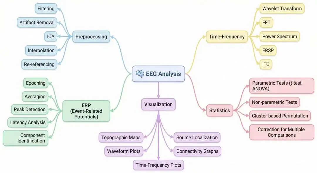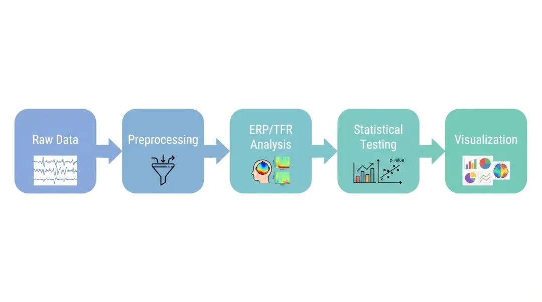 数据导入 → 预处理 → ERP分析 → 时频分析 → 统计检验 → 可视化