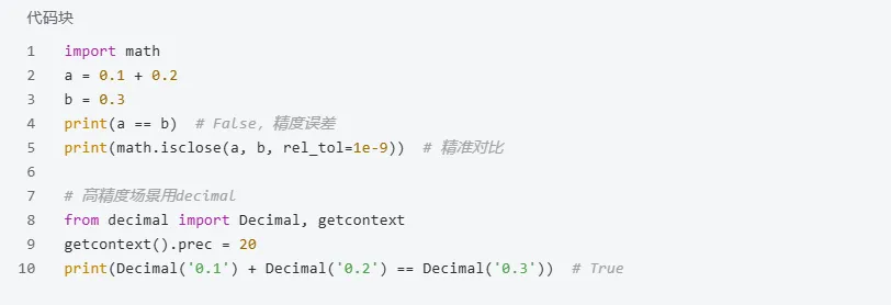 用math.isclose()指定精度,高精度场景换decimal模块即可避坑。