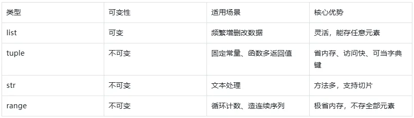 2. 序列:可变用list,固定用tuple,循环用range;