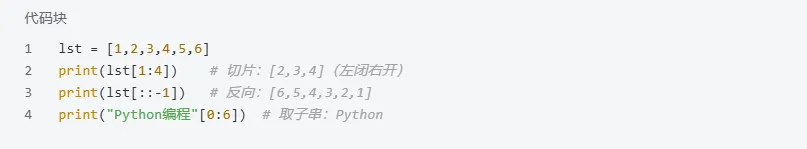 切片是序列神技能,格式seq[start:end:step],正反都能用,不改动原序列。