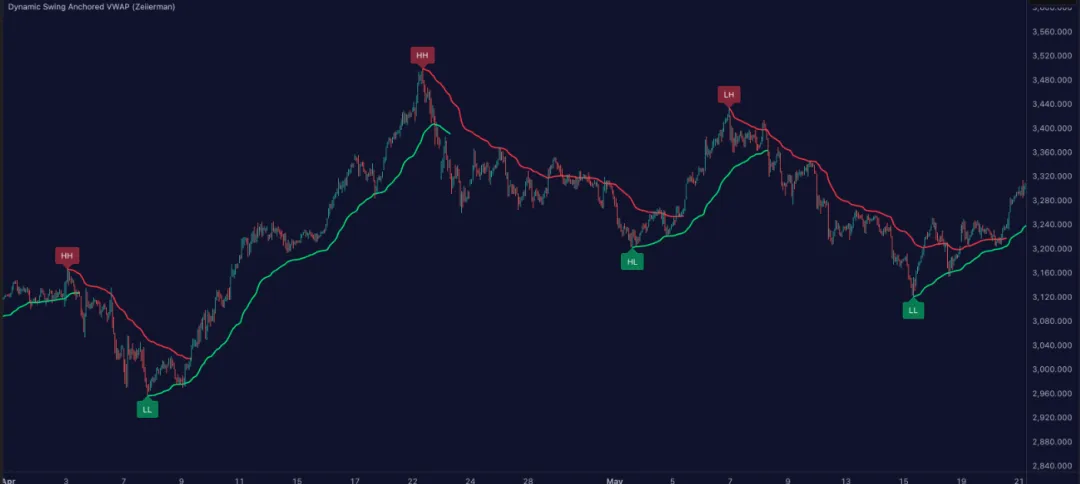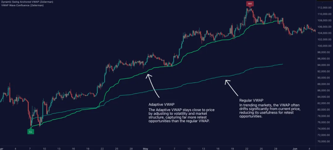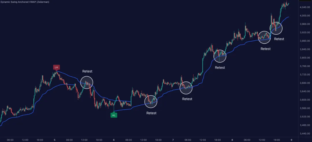以新形成的摆动高低点作为锚定节点,让VWAP的计算基准始终紧跟市场趋势结构的变化。锚点与实时价格的贴近性,使得价格回测指标的频率和有效性显著提升。