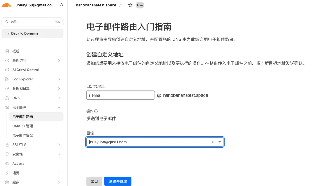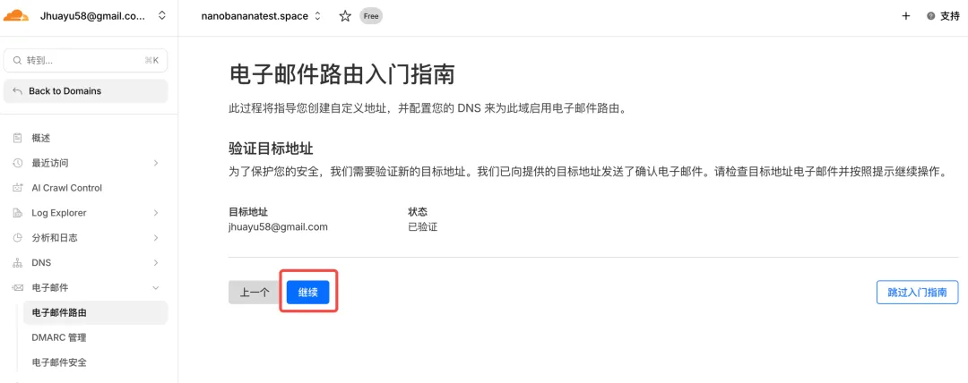 点击继续,这里第一次配置目标地址需要去目标邮箱进行验证