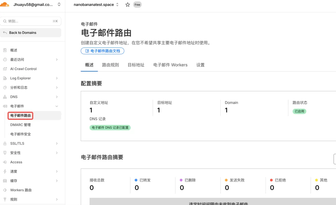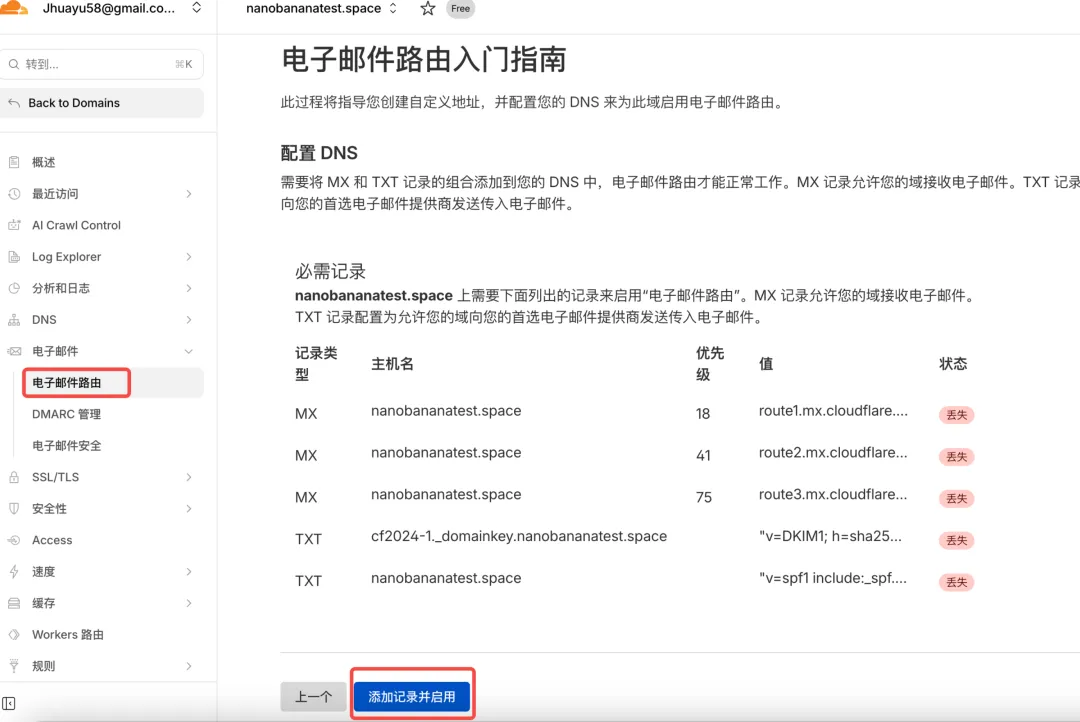 路由状态显示已启用,DNS记录显示已配置