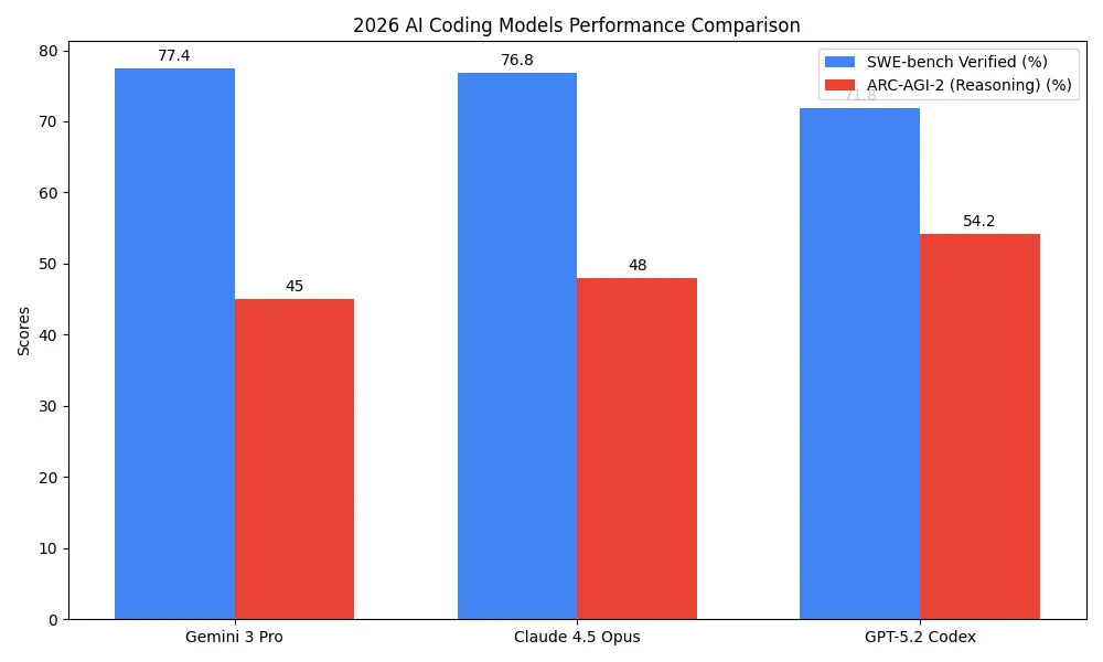 判断一个“工程同事”是否可靠,最直接的方式就是看他的“绩效”。我们参考 2026 年 1 月最新的 AI 编程模型基准测试数据,对这三位顶尖“同事”进行了全面对比。