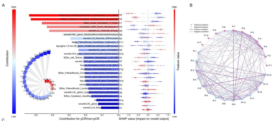 num_vars = len(sorted_features) # 特征数量# 百分比percentages = (sorted_shap_values / sorted_shap_values.sum()) * 100# 每个扇形的宽度widths = (sorted_shap_values / sorted_shap_values.sum()) * 2 * np.pi# 设置基础长度、增量和彩色环宽度base_length, fixed_increment, colored_ring_width = 3.0, 0.5, 2.0# 每个扇形的总长度total_lengths = [base_length + i * fixed_increment for i in range(num_vars)]# 累积角度thetas = np.cumsum([0] + widths[:-1].tolist()) - one_oclock_offsetinset_size = min(left_plot_width, plot_height) * 1.3 # 计算大小# 左边距inset_left = main_ax_left - 0.2# 底边距inset_bottom = plot_bottom - 0.1# 定义插图矩形区域inset_ax_rect = [inset_left, inset_bottom, inset_size, inset_size]# 添加径向极坐标轴ax_radial_inset_new = fig_combined.add_axes(inset_ax_rect, projection='polar')# 背景透明ax_radial_inset_new.patch.set_alpha(0)# 绘制内部背景条ax_radial_inset_new.bar(x=thetas, # 角度height=inner_heights, # 高度width=widths, # 宽度color=inner_colors, # 颜色align='edge', # 对齐方式edgecolor='white', # 边缘颜色linewidth=1.5) # 线宽# 绘制外部彩色条ax_radial_inset_new.bar(x=thetas, # 角度height=[colored_ring_width] * num_vars, # 高度width=widths, # 宽度bottom=inner_heights, # 底部起始位置color=bar_colors, # 颜色align='edge', # 对齐方式edgecolor='white', # 边缘颜色linewidth=1.5) # 线宽# 移除y轴标签ax_radial_inset_new.set_yticklabels([])# 移除x轴标签ax_radial_inset_new.set_xticklabels([])# 隐藏极坐标脊柱ax_radial_inset_new.spines['polar'].set_visible(False)# 隐藏网格ax_radial_inset_new.grid(False)ax_radial_inset_new.set_theta_zero_location('N') # 正北ax_radial_inset_new.set_theta_direction(-1) # 顺时针ax_radial_inset_new.set_ylim(0, max(total_lengths) + 2) # 半径范围