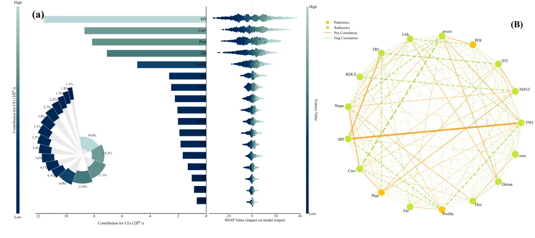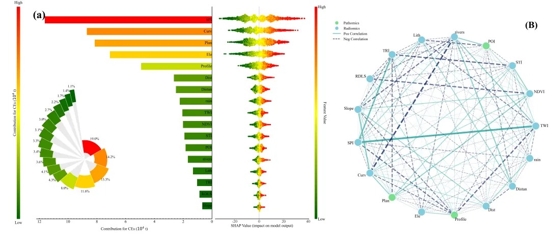 # =========================================================================================# ======================================7.特征重要性条形图+蜂巢图+玫瑰图组合图绘制函数=======================================# =========================================================================================def draw_combined_plot(sorted_features, sorted_shap_values, shap_values, bar_colors, cmap, color_norm):# 创建画布fig_combined = plt.figure(figsize=(34, 25))# 定义边距和间距参数left_margin, right_margin, bottom_margin, top_margin = 0.05, 0.05, 0.02, 0.1space_between = 0.01 # 左右子图之间的间距plot_bottom = bottom_margin # 绘图区域的底部plot_height = 1 - bottom_margin - top_margin # 绘图区域的高度total_plot_width = 1 - left_margin - right_margin - space_between # 宽度# 分配左侧图和右侧图的宽度比例left_plot_width = total_plot_width * 0.6right_plot_width = total_plot_width * 0.4cbar_left = 0.1 # 颜色条位置colorbar_width = 0.01 # 颜色条宽度# 颜色条坐标轴ax_cbar_new = fig_combined.add_axes([cbar_left, plot_bottom, colorbar_width, plot_height])# 创建ScalarMappable对象,用于颜色映射sm = ScalarMappable(cmap=cmap, norm=color_norm)# 绘制颜色条cbar = fig_combined.colorbar(sm,cax=ax_cbar_new,orientation='vertical')# 设置标签cbar.set_label('', size=18, labelpad=5)# 移除刻度cbar.set_ticks([])# 设置刻度位置cbar.ax.yaxis.set_ticks_position('left')# 上文本ax_cbar_new.text(0.5,1.01, # y坐标位置'High', # 文本内容transform=ax_cbar_new.transAxes, # 使用相对坐标ha='center', # 水平居中va='bottom', # 垂直底部对齐fontsize=30) # 字体大小# 左侧条形图的位置main_ax_left = cbar_left + colorbar_width + 0.05# 添加条形图坐标轴ax_bar_new = fig_combined.add_axes([main_ax_left, # 左plot_bottom, # 下left_plot_width, # 宽度plot_height]) # 高度# x轴刻度在底部ax_bar_new.xaxis.tick_bottom()# 设置x轴标签ax_bar_new.xaxis.set_label_position("bottom")# 反转x轴ax_bar_new.invert_xaxis()# 绘制水平条形ax_bar_new.barh(y=range(len(sorted_features)), # 数据width=sorted_shap_values, # 条形宽度color=bar_colors, # 颜色height=0.6) # 条形高度# 反转y轴ax_bar_new.invert_yaxis()# 设置x轴标题ax_bar_new.set_xlabel('Contribution for CEs ($10^4$ t)', size=30, labelpad=20)# 移除y轴刻度ax_bar_new.set_yticks([])# 去掉边框ax_bar_new.spines[['left', 'top']].set_visible(False)# 设置右侧边框位置ax_bar_new.spines['right'].set_position(('data', 0))# 显示边框ax_bar_new.spines['right'].set_visible(True)ax_bar.spines['bottom'].set_visible(True)# 主刻度样式ax_bar_new.tick_params(axis='x', # 轴which='major', # 主刻度direction='in', # 朝内labelsize=30, # 标签大小length=6, # 刻度长度pad=8) # 刻度间距# 图标签ax_bar_new.text(-0.02, # x坐标0.98, # y坐标'(a)', # 文本内容transform=ax_bar_new.transAxes, # 使用相对坐标fontsize=80, # 字体大小weight='bold', # 字体加粗ha='left', # 水平左对齐va='top') # 垂直顶部对齐