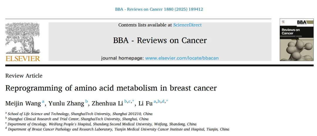 这篇题为《乳腺癌中的氨基酸代谢重编程》的综述文章于2025年发表在《BBA - Reviews on Cancer》期刊上。文章系统性地阐述了不同分子亚型乳腺癌中特定氨基酸(包括谷氨酰胺、胱氨酸、丝氨酸、甘氨酸、色氨酸、精氨酸、酪氨酸和支链氨基酸)的代谢重编程现象,探讨了其背后的分子机制,并总结了针对这些代谢途径的靶向治疗策略的临床前研究及临床试验进展。