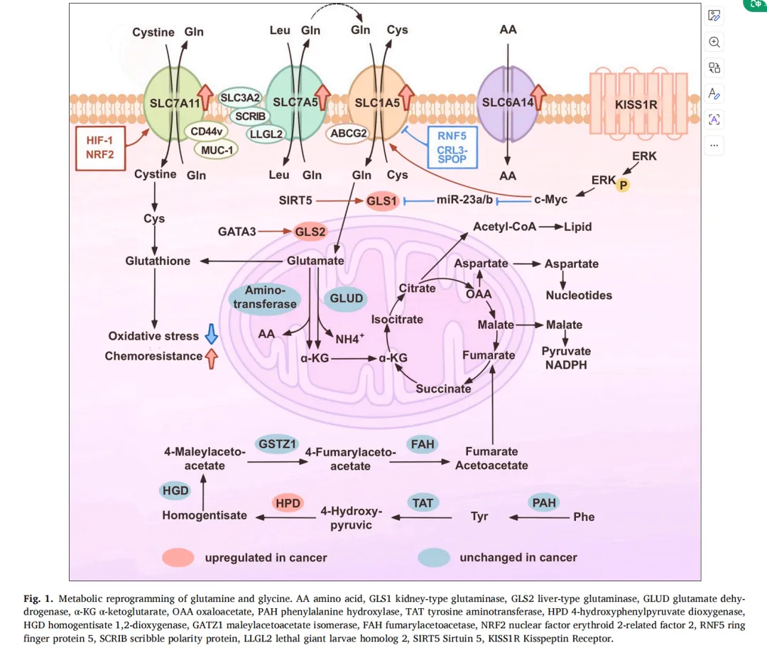 转运蛋白:SLC1A5, SLC7A5, SLC6A14等氨基酸转运蛋白在乳腺癌中高表达,促进谷氨酰胺摄取。