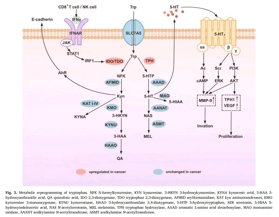 核心作用:色氨酸代谢主要通过犬尿氨酸途径进行,其代谢产物具有免疫抑制作用,帮助肿瘤细胞逃避免疫监视。