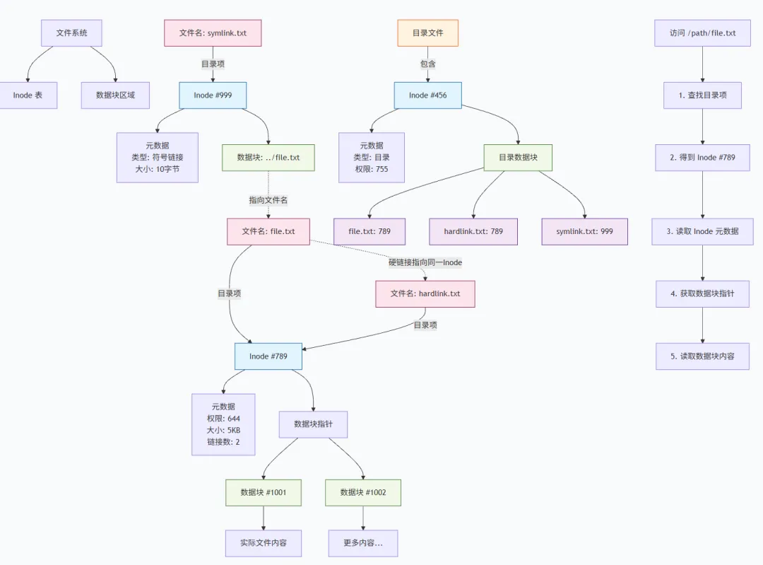 了解完inode结构,我们来说一个误区。很多人误以为“文件名是文件的标识”,但在 Linux 底层,文件名只是 Inode 的“别名”,两者通过“目录项”(dentry)建立关联。
