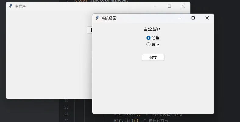 import tkinter as tkfrom tkinter import ttkclassSingletonWindow:"""单例窗口管理器""" _instances = {} # 类属性存储所有单例窗口 @classmethoddefget_window(cls, window_name, parent, build_func):""" 获取或创建窗口实例 window_name: 窗口唯一标识 parent: 父窗口 build_func: 窗口构建函数 """# 检查窗口是否存在且未被销毁if window_name in cls._instances: win = cls._instances[window_name]try: win.state() # 尝试访问窗口状态 win.lift() # 提升到前台 win.focus_force() # 强制获取焦点return winexcept tk.TclError:# 窗口已被销毁,移除记录del cls._instances[window_name]# 创建新窗口 new_win = tk.Toplevel(parent) build_func(new_win)# 绑定关闭事件,清理实例记录defon_close():del cls._instances[window_name] new_win.destroy() new_win.protocol("WM_DELETE_WINDOW", on_close) cls._instances[window_name] = new_winreturn new_win# 实战应用:设置窗口defbuild_settings(window): window.title("系统设置") window.geometry("400x300") ttk.Label(window, text="主题选择:").pack(pady=10) theme_var = tk.StringVar(value="浅色") ttk.Radiobutton(window, text="浅色", variable=theme_var, value="浅色").pack() ttk.Radiobutton(window, text="深色", variable=theme_var, value="深色").pack() ttk.Button(window, text="保存", command=lambda: print(f"已保存:{theme_var.get()}")).pack(pady=20)# 主窗口调用root = tk.Tk()root.title("主程序")defopen_settings(): SingletonWindow.get_window("settings", root, build_settings)ttk.Button(root, text="打开设置", command=open_settings).pack(padx=50, pady=50)root.mainloop()
