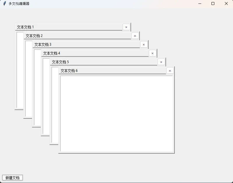 classDocumentWindow: """文档窗口基类""" _doc_count = 0# 文档计数器def__init__(self, parent): DocumentWindow._doc_count += 1self. doc_id = DocumentWindow._doc_count# 在Canvas上创建"窗口"self.frame = ttk.Frame(parent, relief=tk.RAISED, borderwidth=2)# 标题栏 title_bar = ttk.Frame(self. frame, relief=tk.RAISED) title_bar.pack(fill=tk.X)self.title_label = ttk. Label(title_bar, text=f"文档 {self.doc_id}")self.title_label. pack(side=tk.LEFT, padx=5)# 关闭按钮 close_btn = ttk.Button(title_bar, text="×", width=3, command=self.close) close_btn.pack(side=tk.RIGHT)# 内容区域(子类填充)self.content = ttk.Frame(self.frame)self.content.pack(fill=tk.BOTH, expand=True, padx=5, pady=5)# 拖动功能 title_bar.bind("<Button-1>", self.start_drag) title_bar.bind("<B1-Motion>", self.on_drag)self.title_label.bind("<Button-1>", self.start_drag)self.title_label. bind("<B1-Motion>", self.on_drag)defstart_drag(self, event):self._drag_x = event.xself._drag_y = event.ydefon_drag(self, event): x = self. frame.winfo_x() + event.x - self._drag_x y = self.frame. winfo_y() + event.y - self._drag_yself.frame.place(x=x, y=y)defclose(self):self.frame.destroy()# 应用示例:文本编辑器classTextDocument(DocumentWindow):def__init__(self, parent):super().__init__(parent)self.title_label.config(text=f"文本文档 {self.doc_id}")# 添加文本框self.text = tk.Text(self.content, width=40, height=15)self.text.pack(fill=tk.BOTH, expand=True)# 初始位置随机偏移 offset = (self. doc_id - 1) * 30self.frame.place(x=50+offset, y=50+offset, width=400, height=300)# 主程序root = tk.Tk()root.title("多文档编辑器")root.geometry("800x600")workspace = ttk.Frame(root)workspace.pack(fill=tk. BOTH, expand=True)defnew_document(): TextDocument(workspace)toolbar = ttk.Frame(root)toolbar.pack(fill=tk.X)ttk.Button(toolbar, text="新建文档", command=new_document).pack(side=tk.LEFT, padx=5, pady=5)root.mainloop()