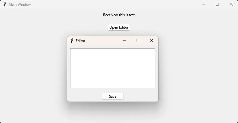 import tkinter as tk from tkinter import ttk defopen_editor(on_save_callback): """ on_save_callback: 保存时触发的回调,参数为编辑结果 """ win = tk.Toplevel() win.title("Editor") text = tk.Text(win, width=40, height=10) text.pack(padx=10, pady=10) defsave(): content = text.get("1.0", tk.END).strip() on_save_callback(content) # Call the callback win.destroy() ttk.Button(win, text="Save", command=save).pack(pady=5) root = tk.Tk() root.title("Main Window") result_label = ttk.Label(root, text="Waiting for input...") result_label.pack(pady=10) defhandle_save(content): result_label.config(text=f"Received: {content[:50]}") ttk.Button(root, text="Open Editor", command=lambda: open_editor(handle_save)).pack(pady=10) root.mainloop()