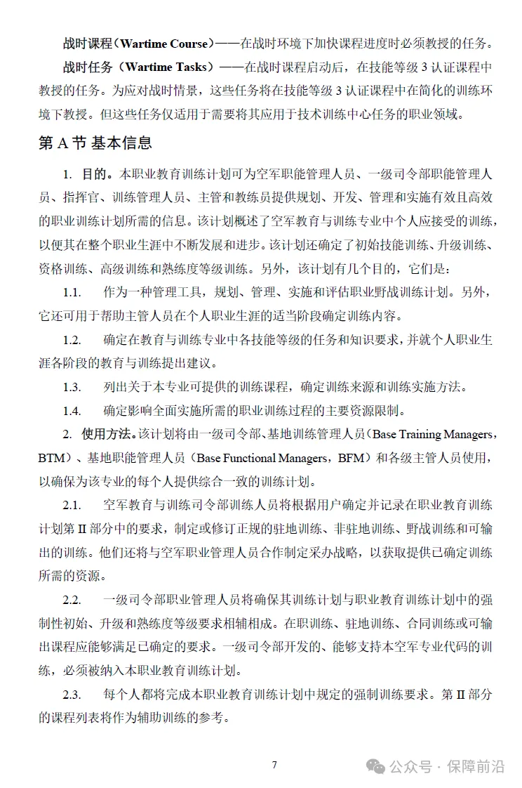 本职业教育训练计划手册是美国空军针对3F2X1教育与训练专业制定的一份全面的教育和训练文件,其受众包括空军职能管理人员、一级司令部职能管理人员、指挥官、训练管理人员、主管和教练员,旨在为相关人员提供明确的职业发展路径并强化职业训练的严谨性。具体分为两部分:第I部分涵盖全面管理3F2X1教育与训练专业所需的信息;第II部分则专注于确定、规划和开展与本计划总体目标相适应的训练。
