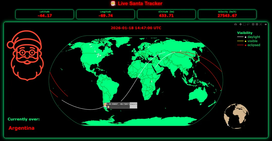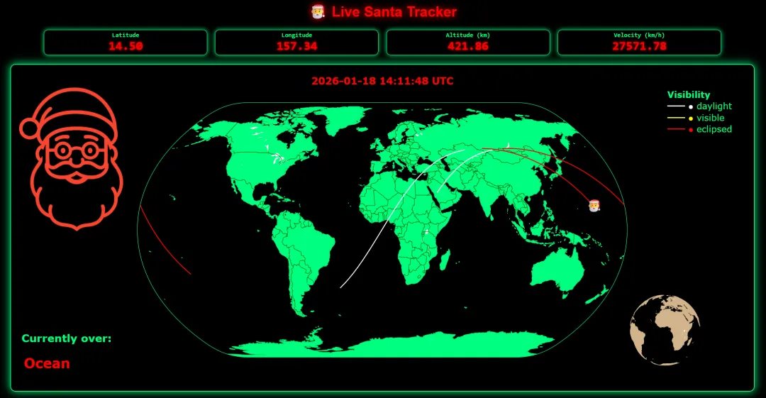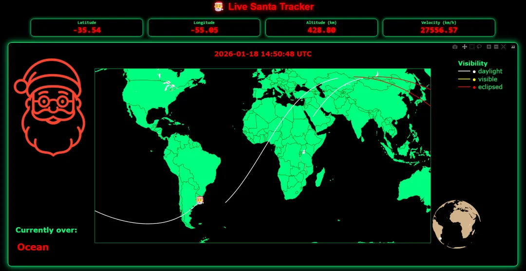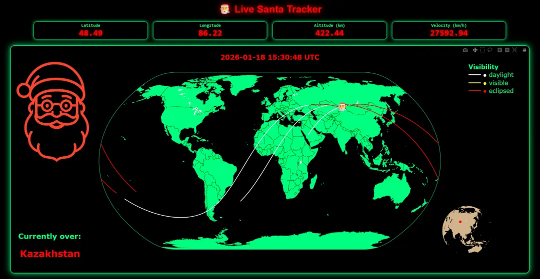 仪表盘会实时显示圣诞老人(其实是国际空间站)的当前纬度、经度、高度和速度。它还会显示他是在白天翱翔、在夜空中疾驰(显示为“日食”),还是在神奇的暮光中滑翔(显示为“可见”)。你还会看到他当前飞越的国家,以及一个可以用光标旋转的迷你地球仪——非常适合追踪圣诞老人的环球旅行。