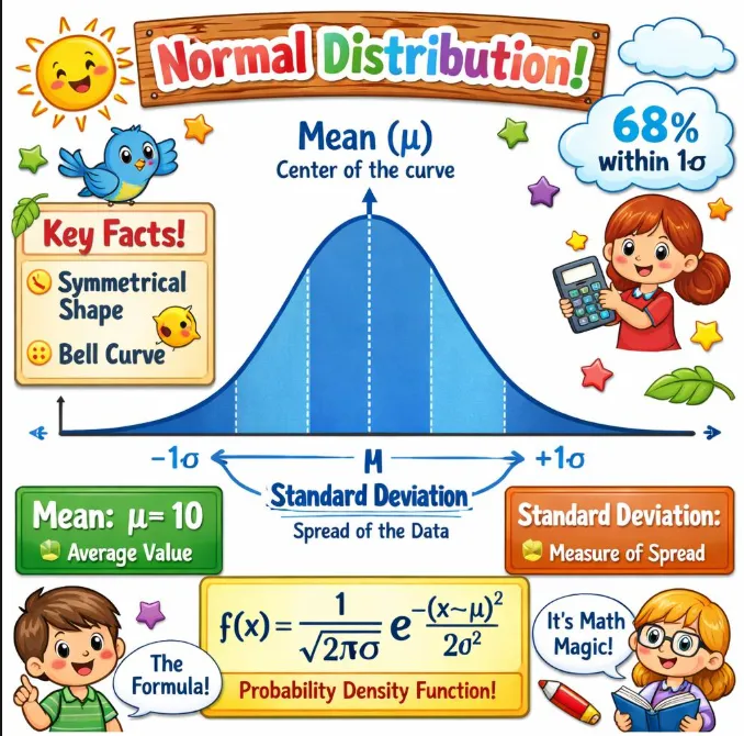 正态分布是一种连续概率分布,其概率密度函数呈对称的钟形曲线,由均值(决定中心位置)和标准差(决定离散程度)完全刻画。数据集中分布在均值附近,约68%、95%和99.7%的观测值分别落在均值±1、±2和±3个标准差范围内。该分布在自然界和社会科学中极为常见(如身高、测量误差),且作为中心极限定理的核心,在统计推断中具有基础地位。