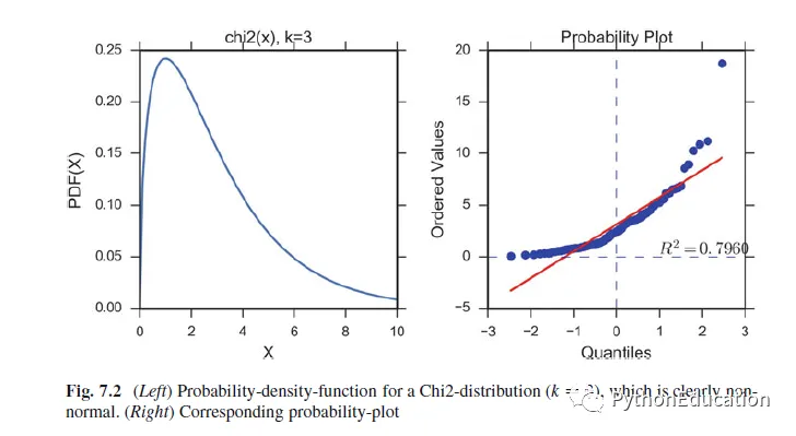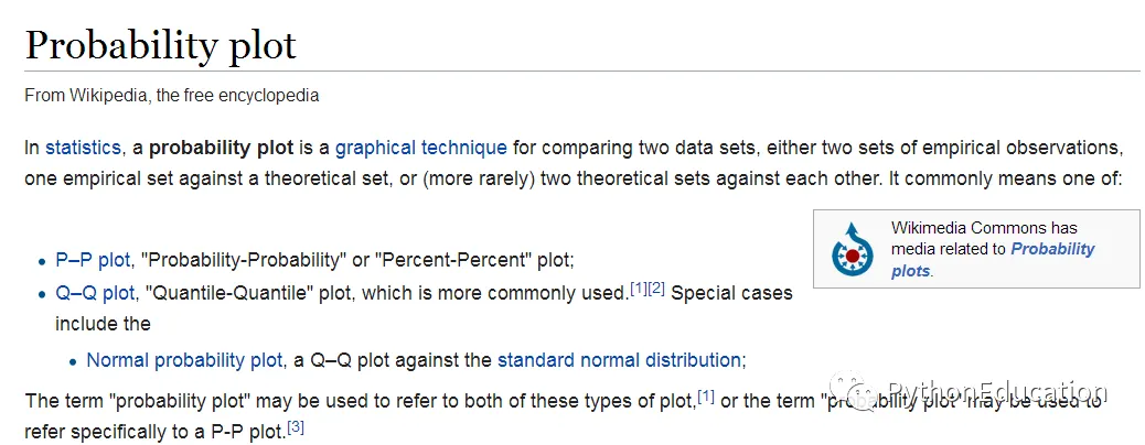 # -*- coding: utf-8 -*-#bug report 231469242@qq.com<br>#微信公众号:pythonEducation'''Graphical and quantitative check, if a given distribution is normal.- For small sample-numbers (<50), you should use the Shapiro-Wilk test or the "normaltest"- for intermediate sample numbers, the Lilliefors-test is good since the original Kolmogorov-Smirnov-test is unreliable when mean and std of the distributionare not known.- the Kolmogorov-Smirnov(Kolmogorov-Smirnov) test should only be used for large sample numbers (>300)'''# Copyright(c) 2015, Thomas Haslwanter. All rights reserved, under the CC BY-SA 4.0 International License# Import standard packagesimport numpy as npimport matplotlib.pyplot as pltimport scipy.stats as statsimport pandas as pd# additional packagesfrom statsmodels.stats.diagnostic import lilliforsdefcheck_normality():'''Check if the distribution is normal.'''# Set the parameters numData = 1000 myMean = 0 mySD = 3# To get reproducable values, I provide a seed value np.random.seed(1234) # Generate and show random data data = stats.norm.rvs(myMean, mySD, size=numData) fewData = data[:100] plt.hist(data) plt.show()# --- >>> START stats <<< ---# Graphical test: if the data lie on a line, they are pretty much# normally distributed _ = stats.probplot(data, plot=plt) plt.show() pVals = pd.Series() pFewVals = pd.Series()# The scipy normaltest is based on D-Agostino and Pearsons test that# combines skew and kurtosis to produce an omnibus test of normality. _, pVals['Omnibus'] = stats.normaltest(data) _, pFewVals['Omnibus'] = stats.normaltest(fewData)# Shapiro-Wilk test _, pVals['Shapiro-Wilk'] = stats.shapiro(data) _, pFewVals['Shapiro-Wilk'] = stats.shapiro(fewData)# Or you can check for normality with Lilliefors-test _, pVals['Lilliefors'] = lillifors(data) _, pFewVals['Lilliefors'] = lillifors(fewData)# Alternatively with original Kolmogorov-Smirnov test _, pVals['Kolmogorov-Smirnov'] = stats.kstest((data-np.mean(data))/np.std(data,ddof=1), 'norm') _, pFewVals['Kolmogorov-Smirnov'] = stats.kstest((fewData-np.mean(fewData))/np.std(fewData,ddof=1), 'norm') print('p-values for all {0} data points: ----------------'.format(len(data))) print(pVals) print('p-values for the first 100 data points: ----------------') print(pFewVals)if pVals['Omnibus'] > 0.05: print('Data are normally distributed')# --- >>> STOP stats <<< ---return pVals['Kolmogorov-Smirnov']if __name__ == '__main__': p = check_normality() print(p)