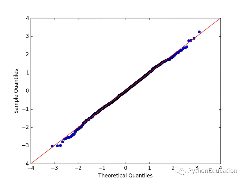 # -*- coding: utf-8 -*-import numpy as npimport statsmodels.api as smimport pylabtest = np.random.normal(0,1, 1000)sm.qqplot(test, line='45')pylab.show()