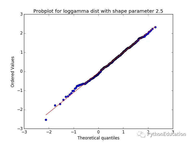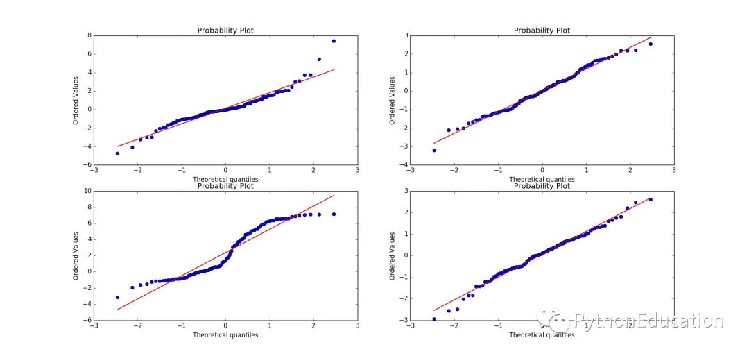 # -*- coding: utf-8 -*-<br>#author:231469242@qq.com<br>#微信公众号:pythonEducationfrom scipy import statsimport matplotlib.pyplot as pltimport numpy as npnsample = 100np.random.seed(7654321)ax1 = plt.subplot(221)#A t distribution with small degrees of freedom:#生成自由度3,样本量100的t分布数据,自由度太小,正态分布性较差x = stats.t.rvs(3, size=nsample)res = stats.probplot(x, plot=plt)#A t distribution with larger degrees of freedom:#自由度大,数据接近正态分布ax2 = plt.subplot(222)x2 = stats.t.rvs(25, size=nsample)res1 = stats.probplot(x2, plot=plt)#A mixture of two normal distributions with broadcasting:ax3 = plt.subplot(223)x3 = stats.norm.rvs(loc=[0,5], scale=[1,1.5], size=(nsample/2.,2)).ravel()res = stats.probplot(x3, plot=plt)#A standard normal distribution:标准正太分布,pp-plot正态性较好ax4 = plt.subplot(224)x4 = stats.norm.rvs(loc=0, scale=1, size=nsample)res = stats.probplot(x4, plot=plt)#Produce a new figure with a loggamma distribution, using the dist and sparams keywords:fig = plt.figure()ax = fig.add_subplot(111)x = stats.loggamma.rvs(c=2.5, size=500)stats.probplot(x, dist=stats.loggamma, sparams=(2.5,), plot=ax)ax.set_title("Probplot for loggamma dist with shape parameter 2.5")plt.show()