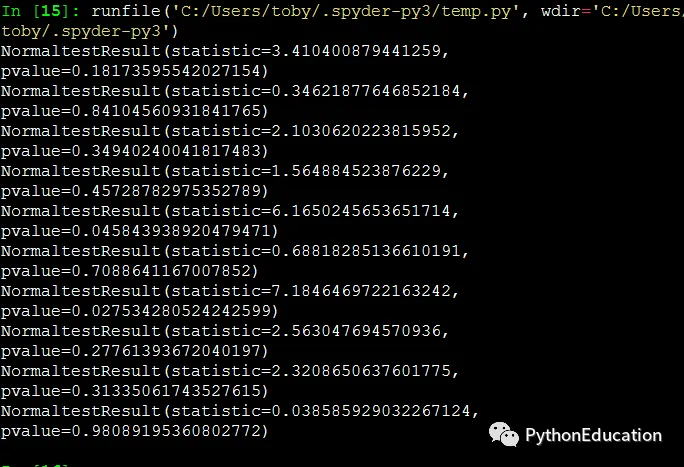 # -*- coding: utf-8 -*-import numpy,scipyfrom numpy import randomfrom scipy import statsfor i in range(0, 10): d = numpy.random.normal(size=50000) n = scipy.stats.normaltest(d)print (n)