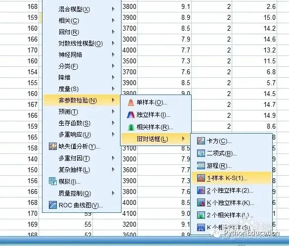 点击“分析”,然后选择“非参数检验(N)”,选择“旧对话框”中的“1-样本K-S(1)”,如图所示。