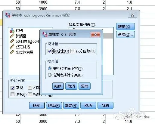 采用柯尔莫诺夫-斯米尔诺夫检验来分析变量是否符合某种分布,可以检验的分布有正态分布、均匀分布、Poission分布和指数分布。指令如下: