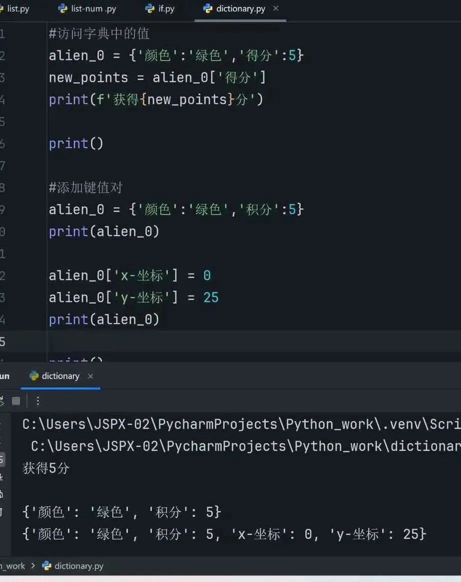 二.添加键值对:可依次指定字典名、用[ ]括起来的键和与该键关联的值。