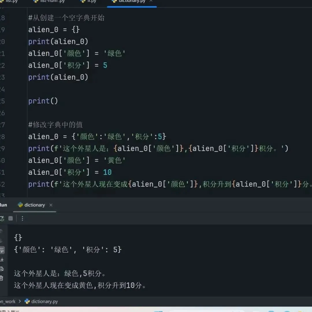 三.从创建一个空字典开始,在空字典中添加键值对很方便,有时是必要的。可先使用一对{ }定义一个空字典,再分行添加各个键值对。