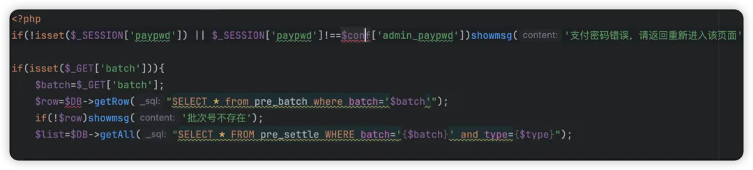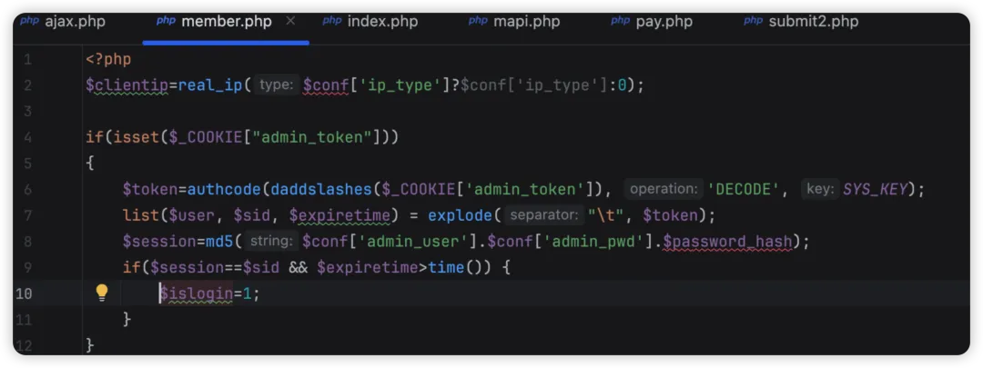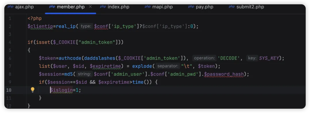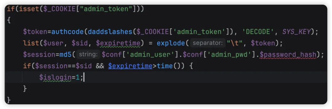 于是想着进行前台寻找SQL注入的地方,但发现均存在预编译以及过滤。例如这种方式,进行了转义,同时又进行排查对应的非字符型注入,尝试绕过这个函数没有结果,于是开始看鉴权,从鉴权地方看看能否做文章了。这里可以看到调用对应的参数islogin变量,如果为1则放行,查看这个变量。这里可以看到,获取我们Cookie当中的admin_token信息,并且进行解密,同时进行分割为user、id、以及时间三种格式,其中通过conf获取admin_user以及admin_pwd的信息,在进行添加一个密码的盐值进行md5加密,最后进行比较,查看加密的md5是否和sid相同,如果相同默认具备后台权限。
