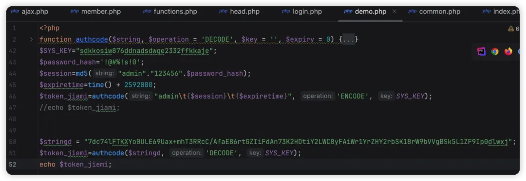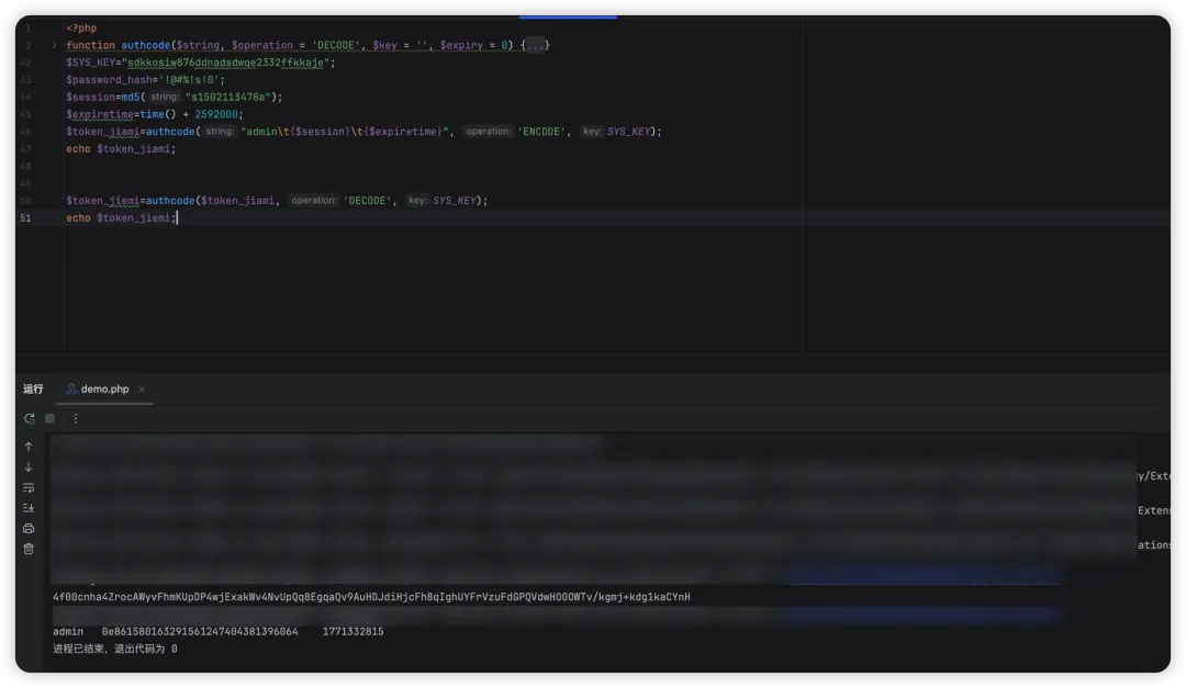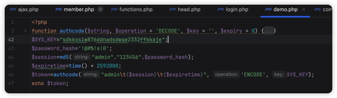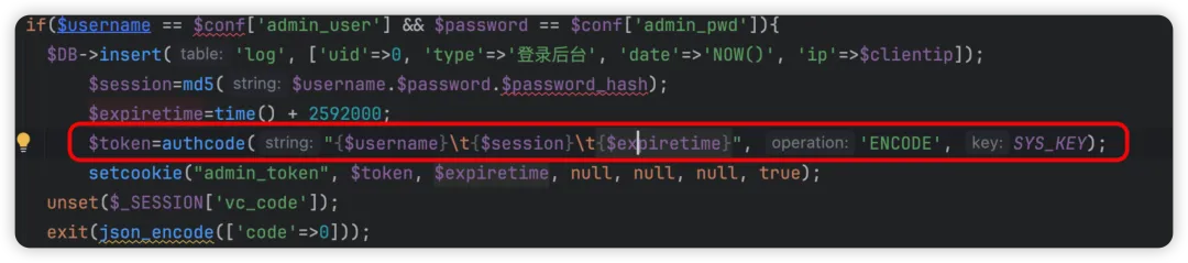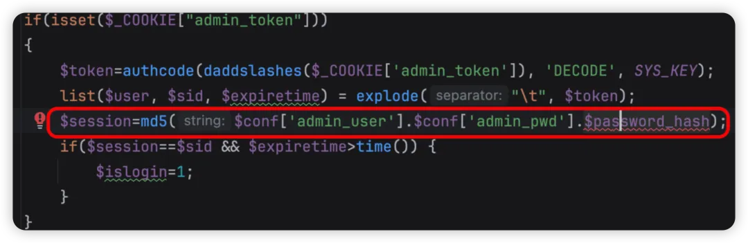 这里首先鉴权的admin_user是就是管理员账号,admin_pwd是管理员密码,后面password_hash是加密的盐值,三个组合在一起进行md5加密,并且与Cookie当中admin_token当中通过\t分离出来的第二个参数来进行md5比对,这里写一个小demo来生成一个正常的值。