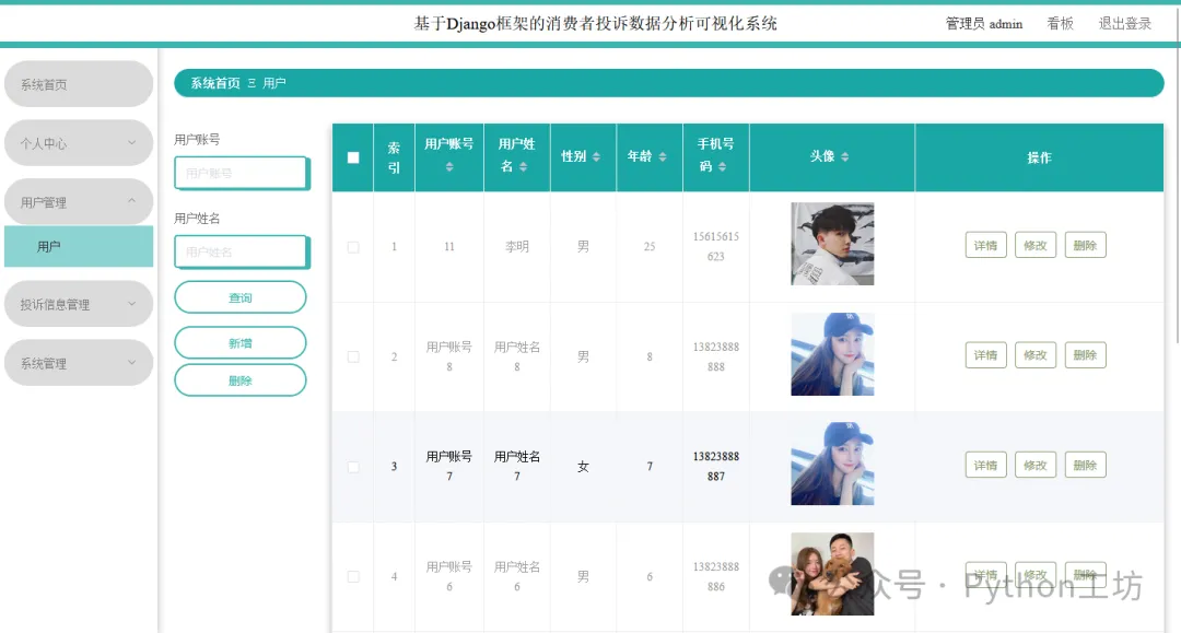 基于Python+Django+MySQL的消费者投诉数据可视化分析系统通过连接数据库获取数据,具体可以看下方的过程展示。功能包括学生数据展示,咨询师数据展示,学院信息展示,学生登录预约,管理员管理回复等页面。数据库的修改可以通过Navicat这个数据库操作软件进行修改。源码提供了制作好的投诉信息sql文件,只需要导入Navicat就可以实现可视化的分析,非常方便,使用简单,可以免费提供Navicat的使用指导哦。