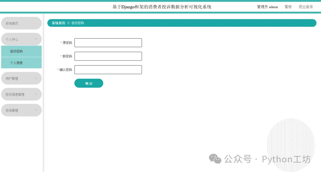 点击看板功能就能进入前台看板,查看信息的总览信息,包括对系统的介绍和投诉信息系的可视化展示。[图片]