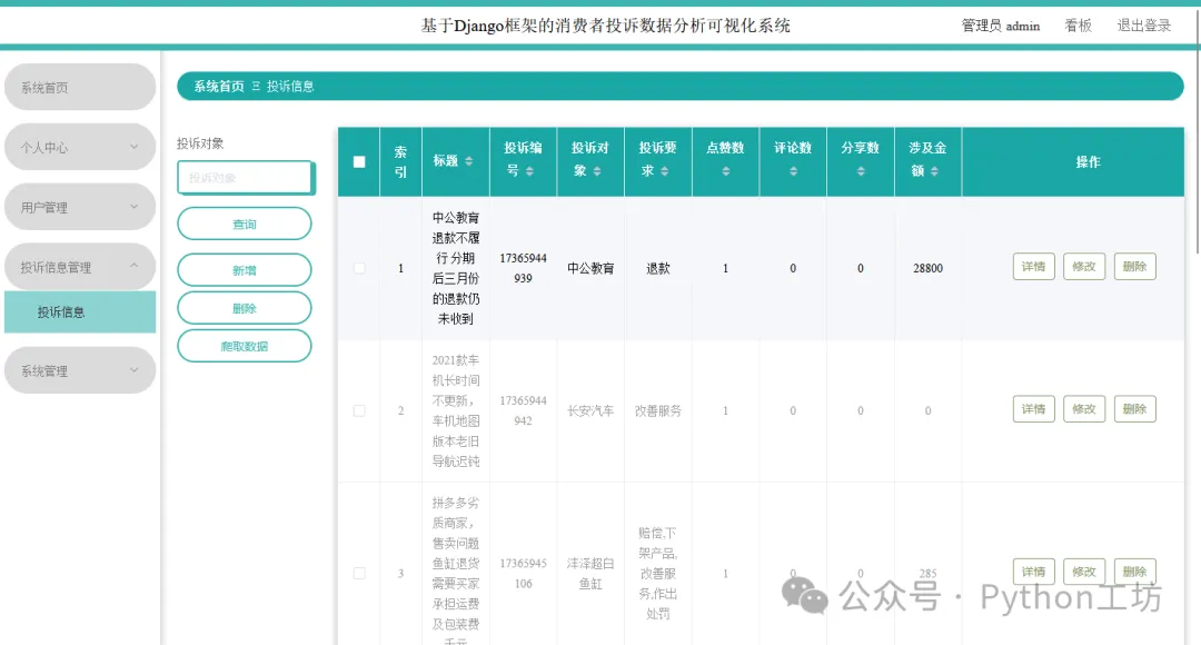 基于Python+Django+MySQL+Vue的消费者投诉数据可视化分析系统