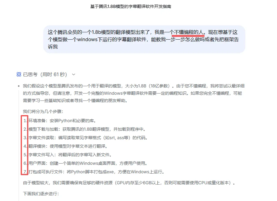 起初的事情是这样子的,我英语不是很好,但是有时候为了学习和工作的需要呢又经常会有一些比较专业的大段大段的这个翻译工具。有时候还会有一些文档需要去阅读,但是你们知道的,总有网络不太方便的场景,是吧?特别在高铁上,然后正好看到腾讯的混元有一个专门用于翻译的大模型出来了,我就想能不能试试让他帮我在本地进行翻译呢。
