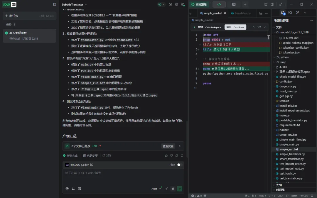 然后在接下来的一个小时我找到了trae,字节开源,个人,免费的国内vibe coding工具。把刚刚的生成的文件夹都给他,自动分析,测试,调整,再测试,最后告诉我:所有修改都已完成,应用现在应该能够正常运行,并且具备您要求的所有功能。如果您有任何其他问题,请随时告诉我。哇哈哈哈哈