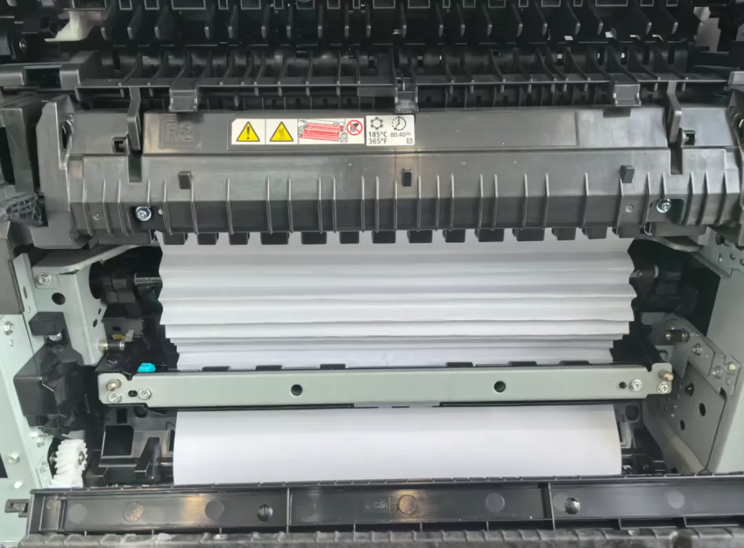 机器使用原装粉盒,出现频繁卡纸,纸一张也过不去,纸张未上定影器,故障现象如下图