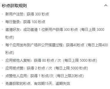 注册送300秒点,每日登录送100秒点(免费获取的秒点,有效期15天,逾期失效);每次对话消耗15秒点……(详情可以看下图)