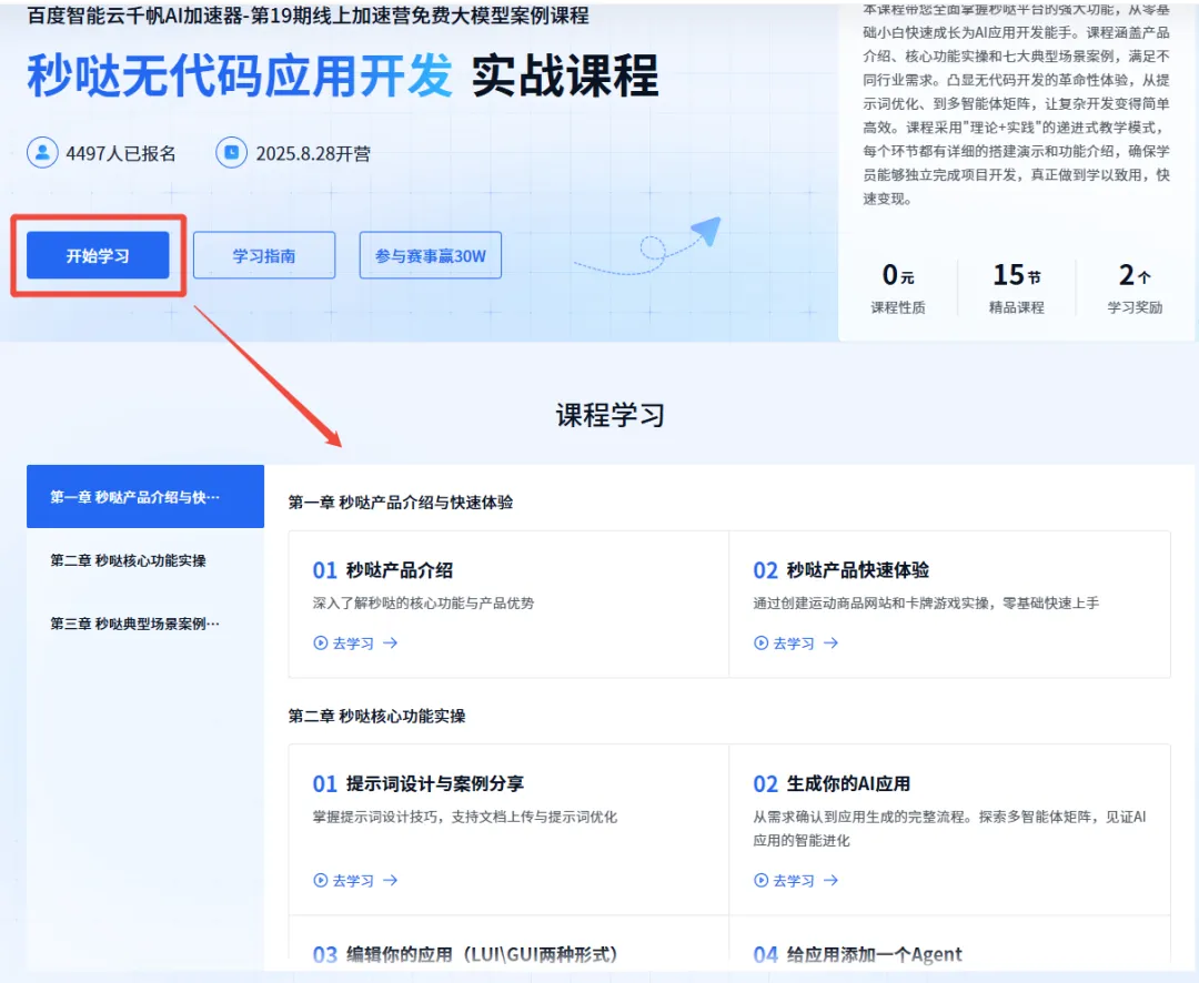 虽然秒哒的口号是“一句话 做应用”,但实际上,一句话是远远不够的 ┐(´∇`)┌你要给ai讲清楚你的逻辑、具体需求,还要经过几轮调整,不会一蹴而就。比如你做的应用是什么类型?目标是什么?受众是什么?需要哪些功能模块?视觉风格如何? 好玩的一点是,可以直接在应用上编辑,非常直观 ( ̄▽ ̄)~*秒哒还提供了官方教程,网址:https://cloud.baidu.com/partner/training-camp/3cow1rzi2ux.html点一下“免费报名”→就变成“开始学习”了(提前登录百度账号的情况下)