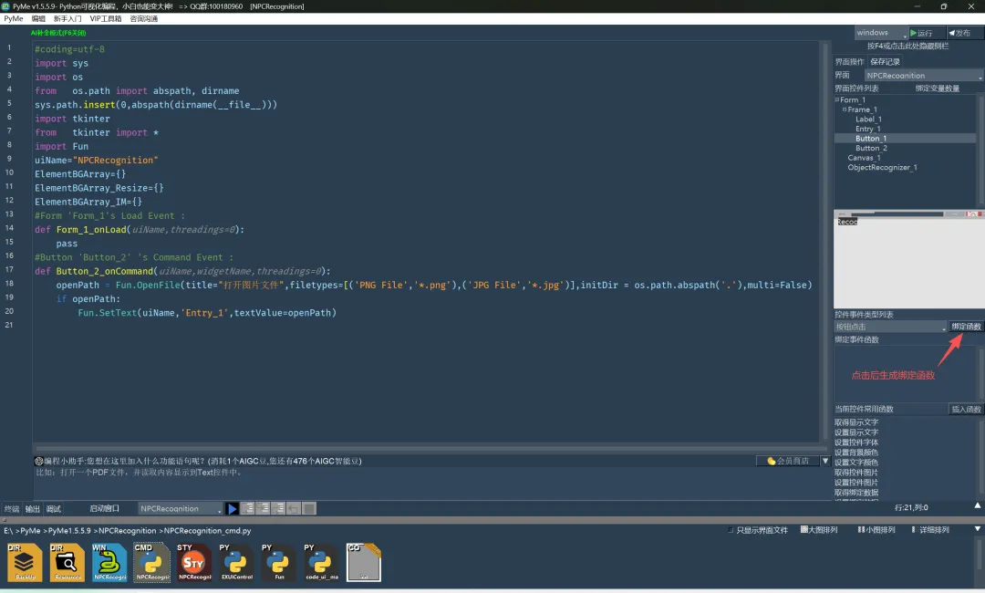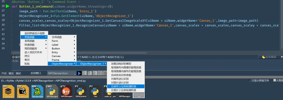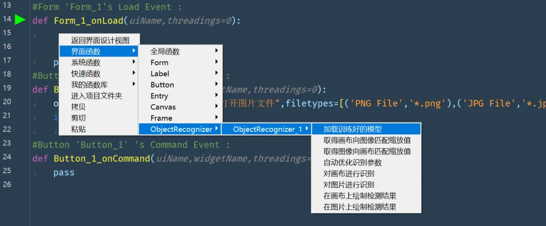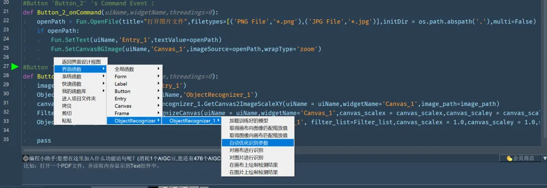 #Button 'Button_1' 's Command Event :def Button_1_onCommand(uiName,widgetName,threadings=0): image_path = Fun.GetText(uiName,'Entry_1') ObjectRecognizer_1=Fun.GetElement(uiName,'ObjectRecognizer_1') canvas_scalex,canvas_scaley=ObjectRecognizer_1.GetCanvas2ImageScaleXY(uiName = uiName,widgetName='Canvas_1',image_path=image_path) Filter_list=ObjectRecognizer_1.RecognizeCanvas(uiName = uiName,widgetName='Canvas_1',canvas_scalex = canvas_scalex,canvas_scaley = canvas_scaley, show_result=False, save_result=False, result_path=None, conf_threshold=0.05, use_template_matching=True, area_ratio_threshold=0.3, fast_mode=False) ObjectRecognizer_1.DrawResultToCanvas(uiName = uiName,widgetName='Canvas_1', filter_list=Filter_list,canvas_scalex = 1.0,canvas_scaley = 1.0,save_image_path='')