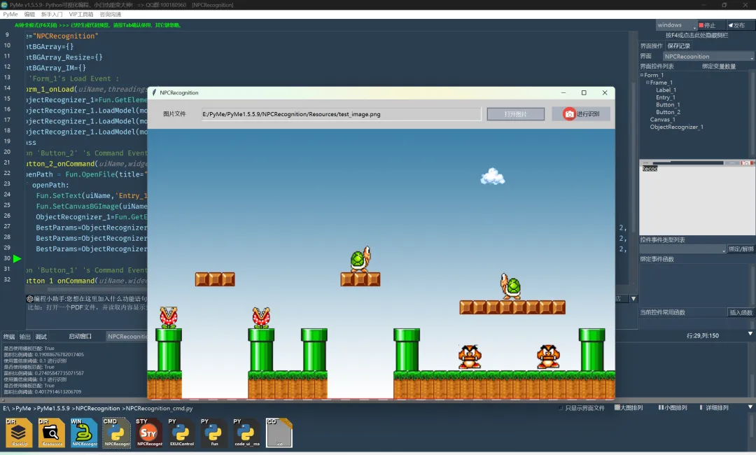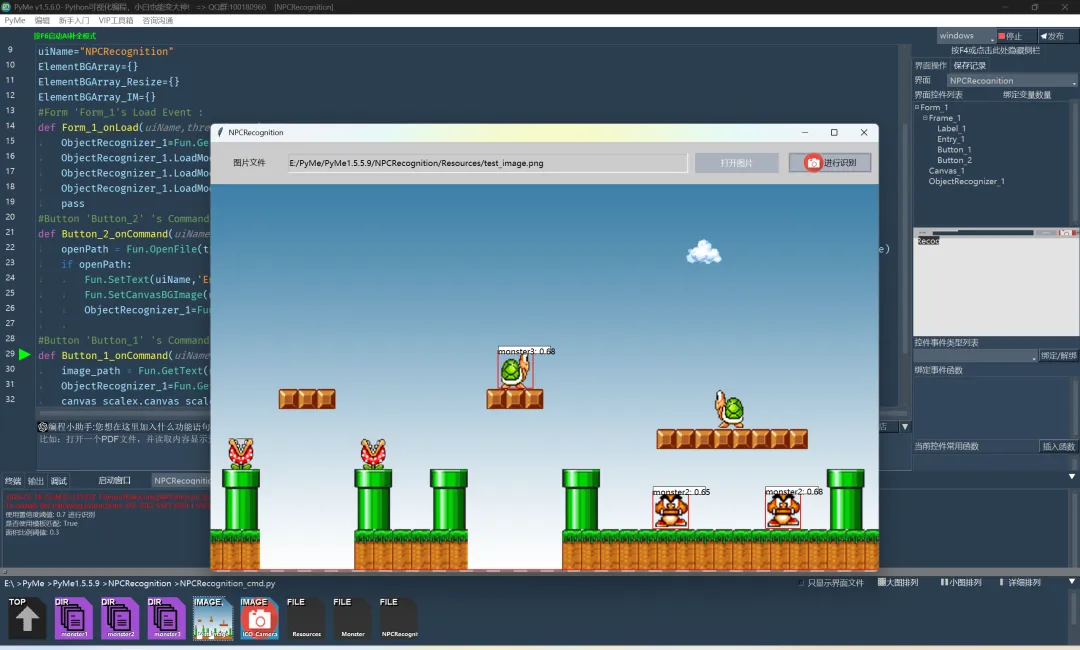 如果想要保存出一个图片文件,可以为save_image_path设置一个文件名,识别时就会将识别后的结果保存为图片。 现在我们的基本工作已经完成,找一张游戏画面图片来识别一下: 我们希望在这张图上识别出这些小怪物,运行程序后,点击”打开图片“按钮,将图片加载并显示到画布上,再点击”进行识别“。 可以看到,已经能识别到一些小怪物啦!但还有一些小怪物识别不成功,这个准确度就需要我们来增强训练数据的同时,对有些阈值参数(置信度、面积)进行优化,下面我们可以对这些参数进行自动优化,我们在点击”打开图片“按钮的函数中,追加”自动优化识别参数“。 这个”自动优化识别参数“可以让图像识别组件根据图像上的目标数来自动调整和优化参数。在这里我们将model_index分别填0,1,2,因为每个小怪物的数量都是2,所以target_count都填2.BestParams=ObjectRecognizer_1.OptimizeRecognition(image_path=openPath,image_scalex = 1.0,image_scaley = 1.0, model_index = 0, target_count = 2, save_to_model = True)BestParams=ObjectRecognizer_1.OptimizeRecognition(image_path=openPath,image_scalex = 1.0,image_scaley = 1.0, model_index = 1, target_count = 2, save_to_model = True)BestParams=ObjectRecognizer_1.OptimizeRecognition(image_path=openPath,image_scalex = 1.0,image_scaley = 1.0, model_index = 2, target_count = 2, save_to_model = True)