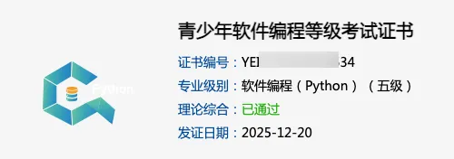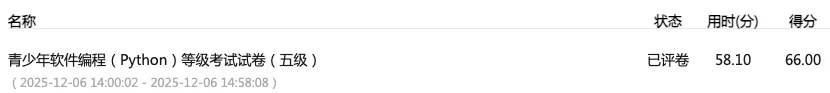 上次写了娃自学Python编程考电子学会五级的事情,一直没有写后续,后台有人私信询问:“你家大宝Python五级过了没?”,过了过了,其实早就出结果了,一直没顾得上写,这次过得比较惊险,最后的分数是66分,刚刚比及格线多出6分。