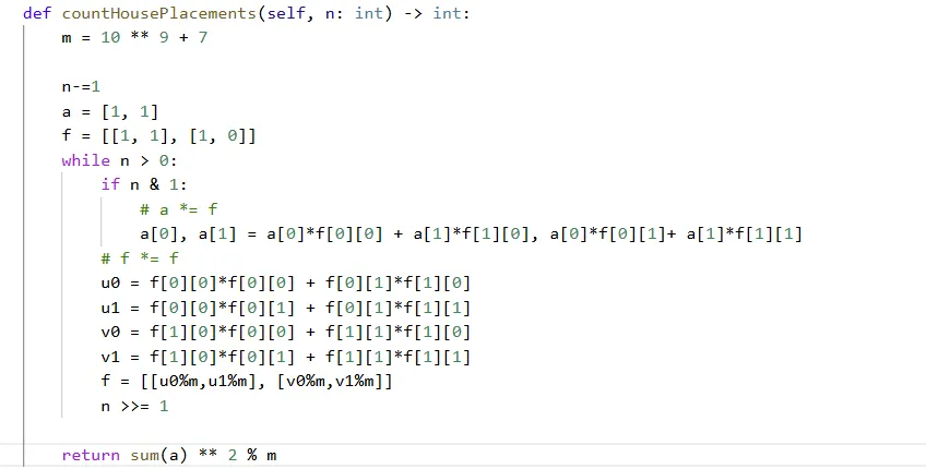 现要求街道同一侧不能存在两所房子相邻的情况,请你计算并返回放置房屋的方式数目。由于答案可能很大,需要对 109 + 7 取余后再返回。