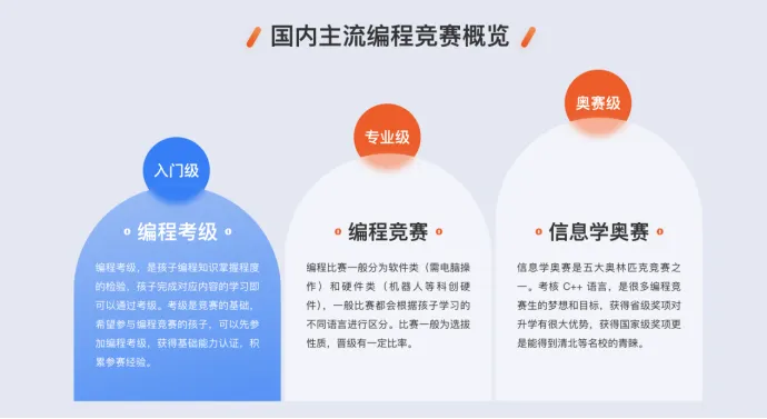 编程考级,是孩子编程知识掌握程度的检验,孩子完成对应内容的学习即可以通过考级。考级是竞赛的基础,希望参与编程竞赛的孩子,可以先参加编程考级,获得基础能力认证,积累参赛经验。