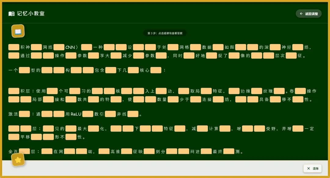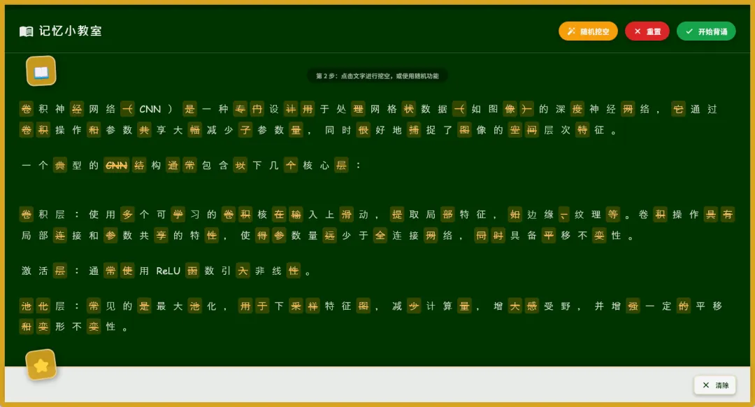 为什么做它?因为我想要一个挖空工具考试前背课文,一遍遍还是不进脑子?面试前背了十遍“自我介绍”,临场还是忘词?这些我都经历过。于是我想:能不能把课堂上老师用粉笔在黑板上“挖空填空”的方法,变成一个随时可用的数字工具?