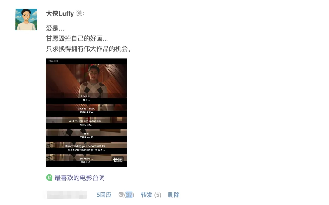 但是当我开始做这个台词拼图的时候,就发现弄起来特别麻烦,要先截图保存到电脑,然后用一个拼图软件建个画布,最后把这些图片手工排好,弄下来可能5分钟就过去了,分享的兴致都少了一半。