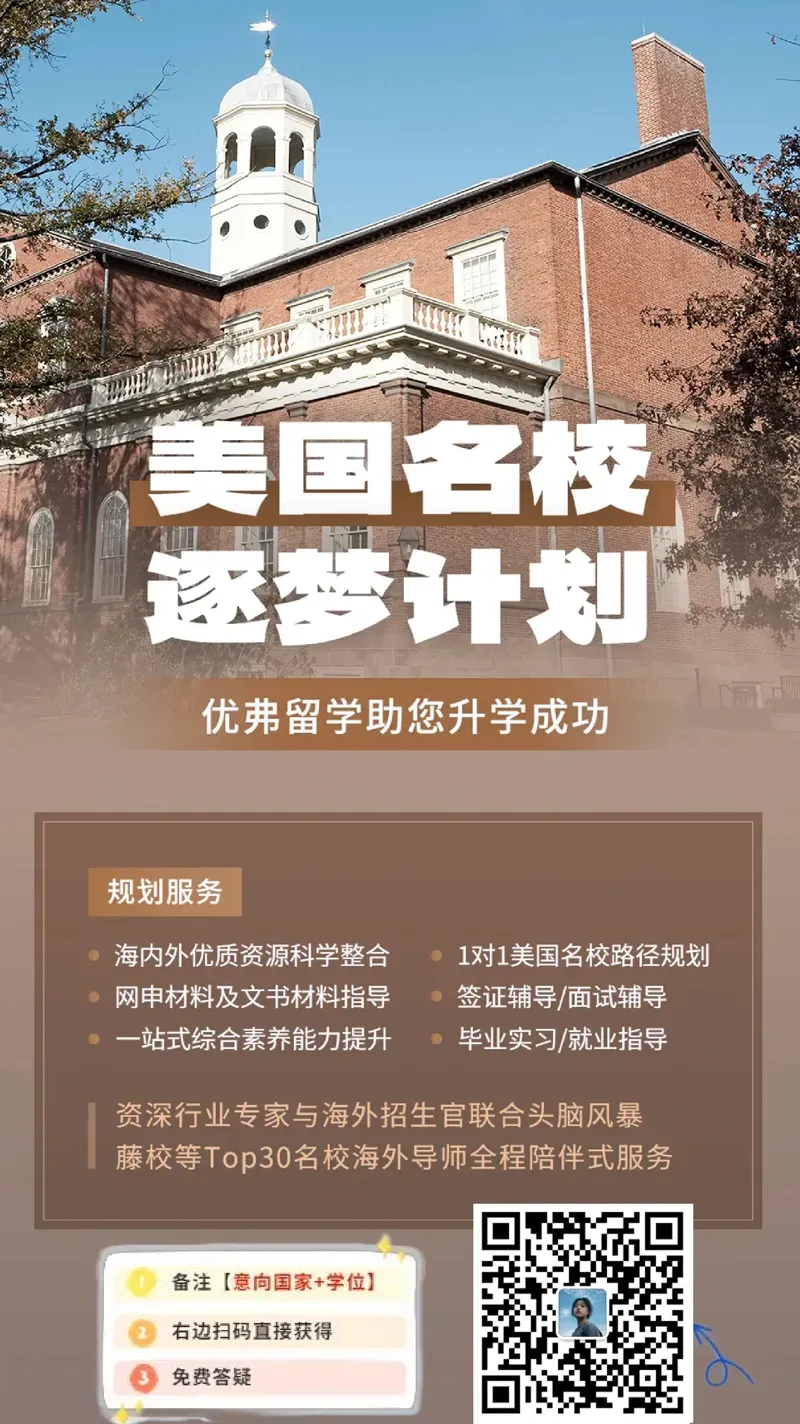 如果你也是个普娃,在考虑美本、申研、正在迷茫、也许有些不确定:可以扫码找优弗留学的老师聊聊。他们有一手的高端申请案例库和申请经验,也能根据你个人情况给出精准建议。少一点试错,多一点确定性。