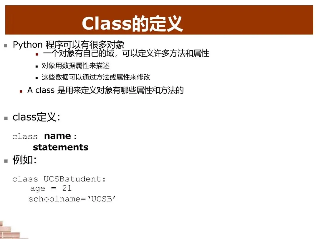 类定义了一类对象的蓝图。它指定了对象有哪些属性(数据)和方法(行为)。在Python中,使用class关键字定义类,后跟类名和冒号,然后是类体。类体中的语句通常包括属性定义和方法定义。例如,我们可以定义UCSBstudent类,包含age和schoolname属性。类名通常使用驼峰命名法,以区别于变量和函数。